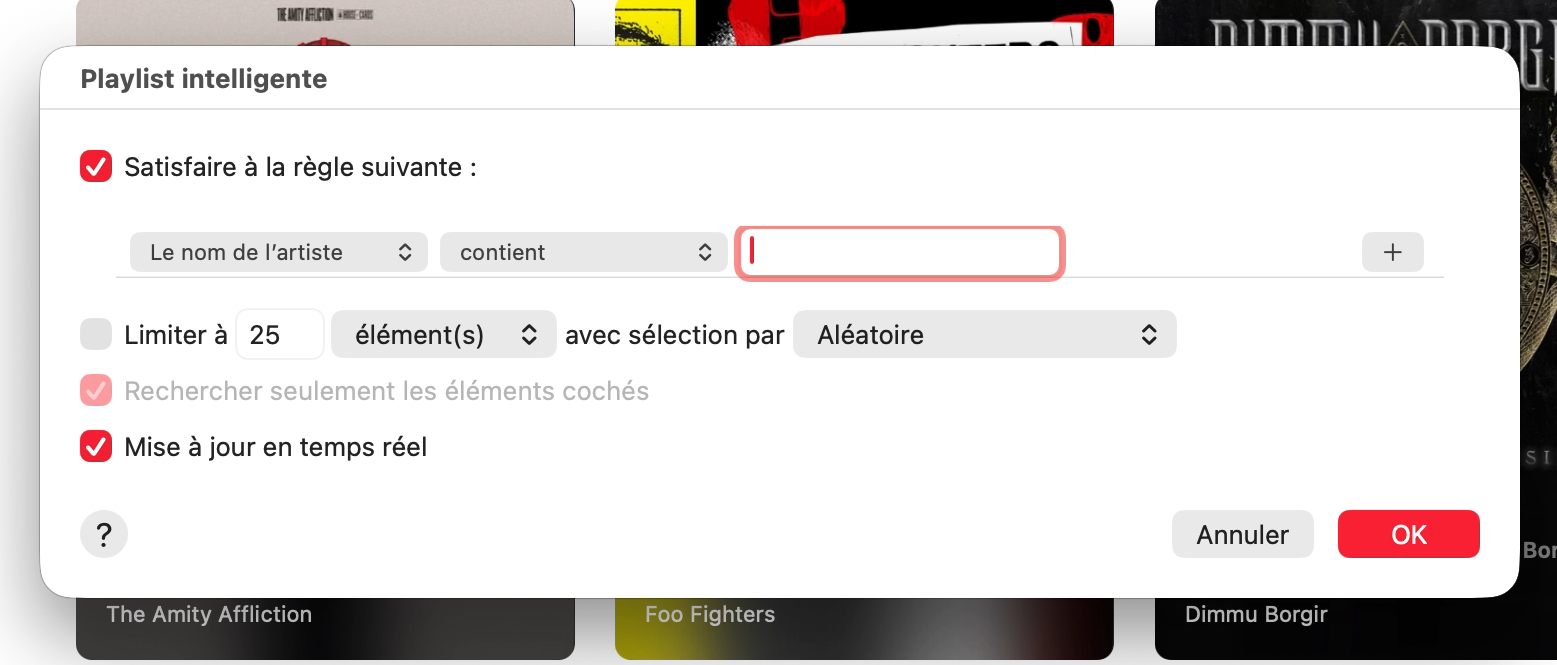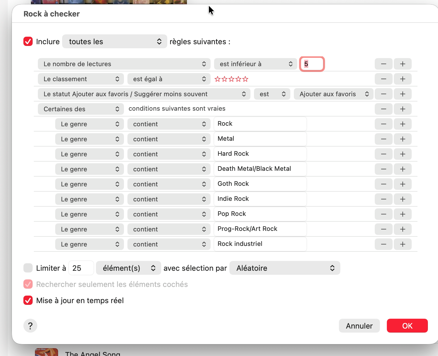 C’est pour cette raison que j’ai créé différentes listes de lecture intelligentes, chacune par genre avec comme règles :
